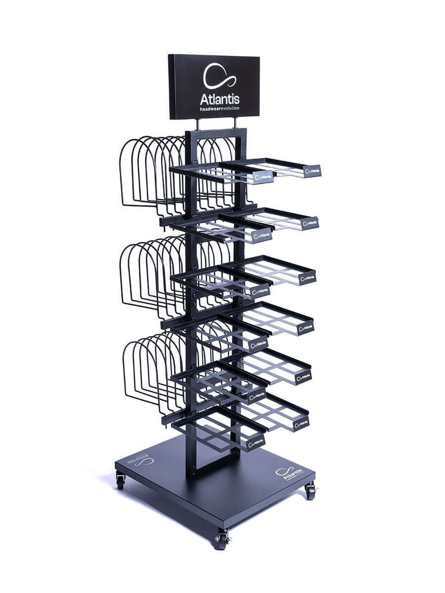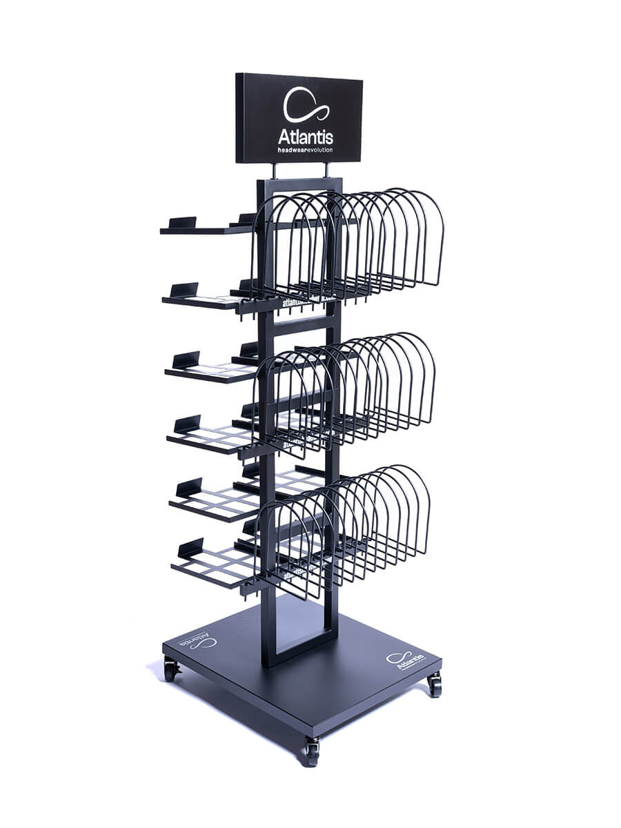 - Espositore bifacciale con 24 rastrelliere per capplli Baseballl e 3 set di ganci per cuffie